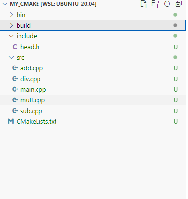 准备了一下6个文件(5个.cpp 1个头文件),bin文件夹用来存放生成的可执行文件,build文件夹存放与项目源码无关的文件。