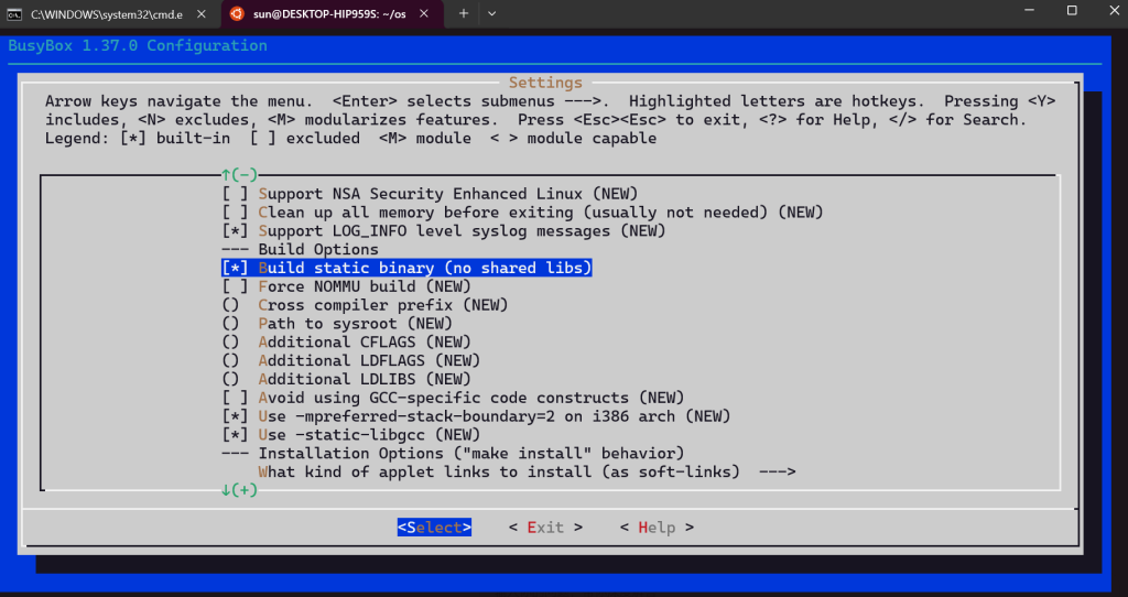 Setttings 选中 Build static binary (no shared libs), 使其编译成静态链接的文件, 因为bzImage内核本身不提供glibc