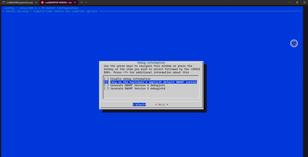之前编译内核的时候,我们直接选择save,linux默认生成不带有调试信息的内核。现在需要修改linux配置, 导航到 Kernel hacking → Compile-time checks and compiler options → Debug information,选择Generate DWARF Version 5 debuginfo.之后重新make -j$(nproc)