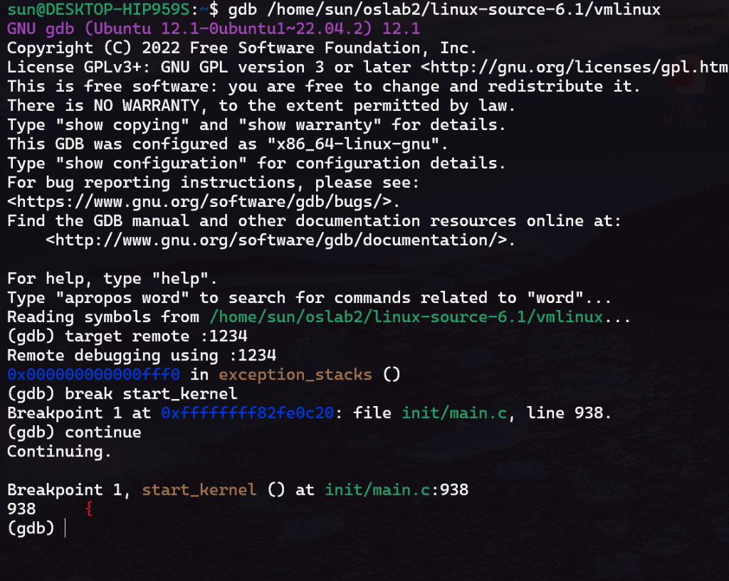 gdb /home/sun/oslab2/linux-source-6.1/vmlinux
