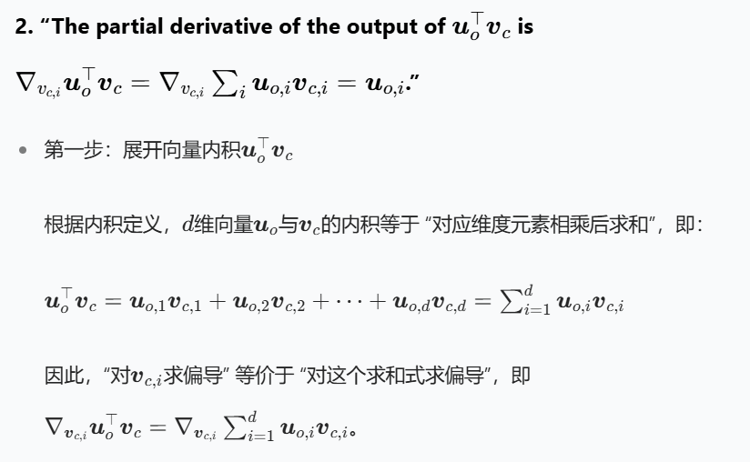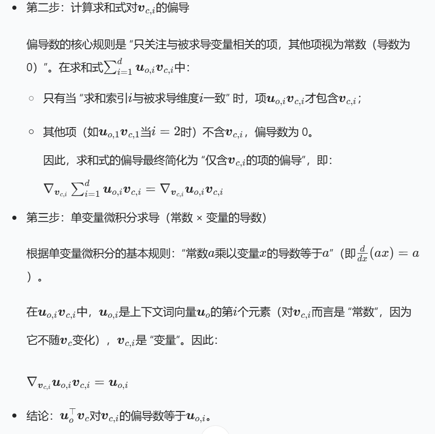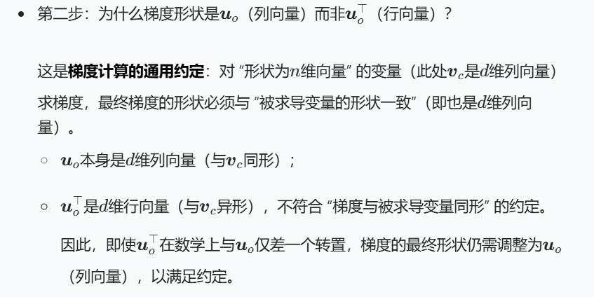 我们将写出损失函数对参数vc的偏梯度。(uo同理)