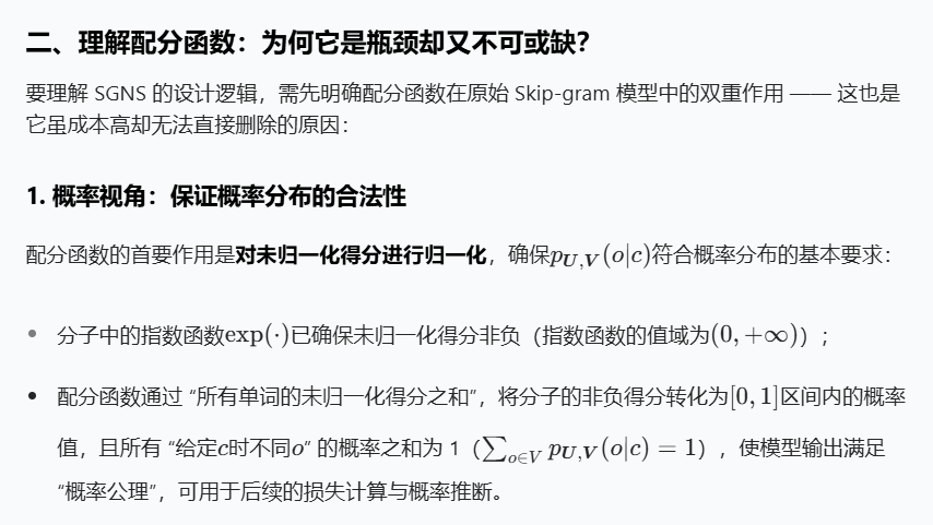 - 求和项:遍历词汇表 V 中的所有单词 w,计算每个 w 的上下文向量uw与中心词 c 的中心向量vc 的内积,并对结果取指数后求和。这一求和项被称为 “归一化因子” 或 “分区函数(Partition Function)”。
