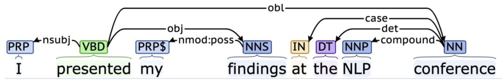 • RIGHT-ARC:将栈上的第一个(最近添加的)项目标记为第二个项目的从属项,并从栈中移除第一个项目,同时将第二个词→第一个词的依存关系添加到依存关系列表中。