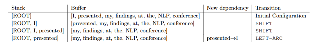 起初,栈中只包含ROOT,依赖列表为空,缓冲区按顺序包含句子的所有单词。在每一步中,解析器都会对部分解析结果应用一个转换,直到缓冲区为空且栈的大小为1。